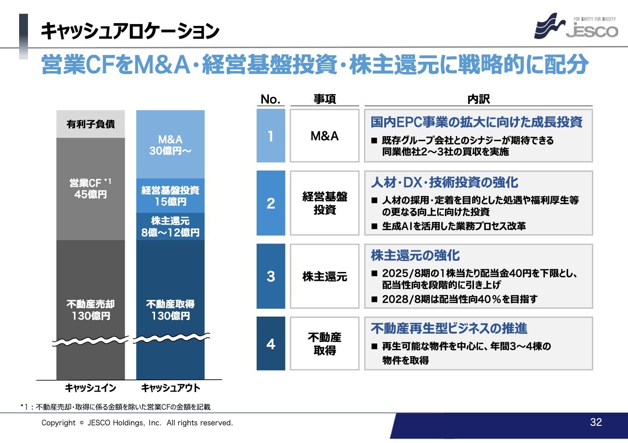 キャッシュアロケーションをご説明します。スライドは3年間の合計で記載していますが、営業キャッシュフローについては、今までご説明したように、さらなる成長に向けたM&Aや経営基盤の強化、株主還元に戦略的に配分していきたいと考えています。