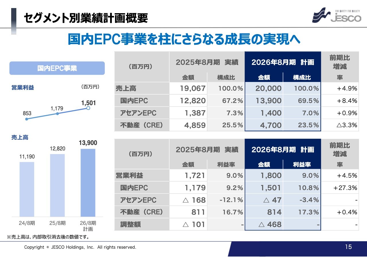 セグメント別業績計画概要です。国内EPC事業は売上高139億円、営業利益15億100万円と、さらなる成長を計画しています。