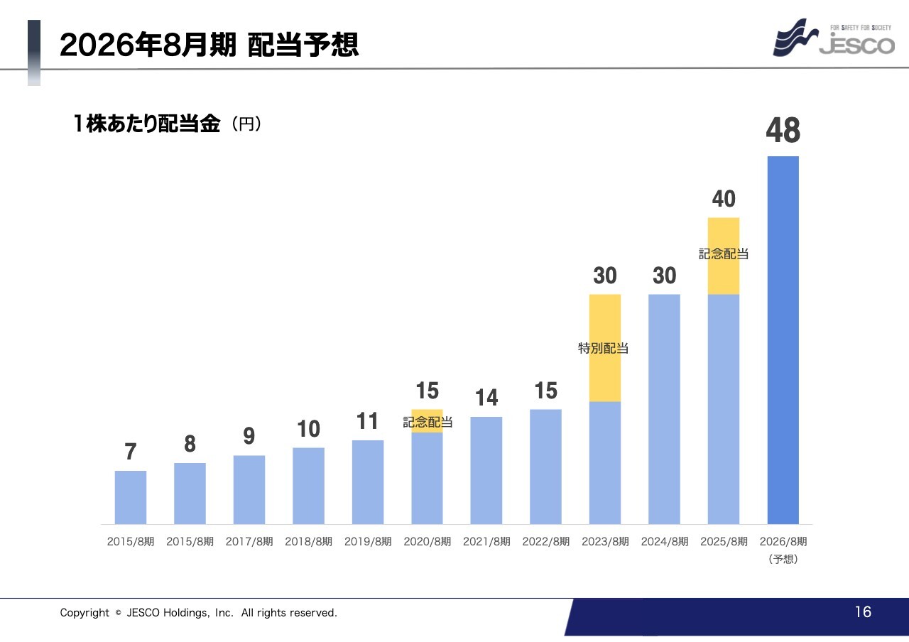 2026年8月期の配当予想です。当社は上場以来、配当を拡大してきました。2025年8月期は記念配当を含み40円ですが、2026年8月期の予想は48円としています。