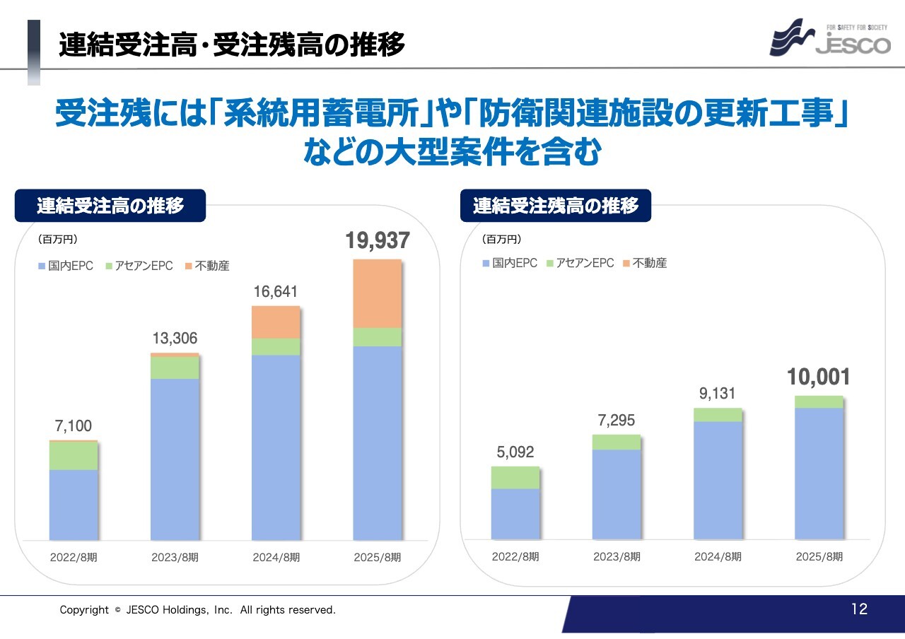 スライド右側、連結受注残高の推移は、不動産を含まず、国内EPC事業とアセアンEPC事業の受注残高を表したものです。2025年8月期は大台の100億円となりました。受注残には、国内EPC事業において新たに取り組みを進める系統用蓄電所や、防衛関連施設の更新工事等、大型案件を含んでいます。