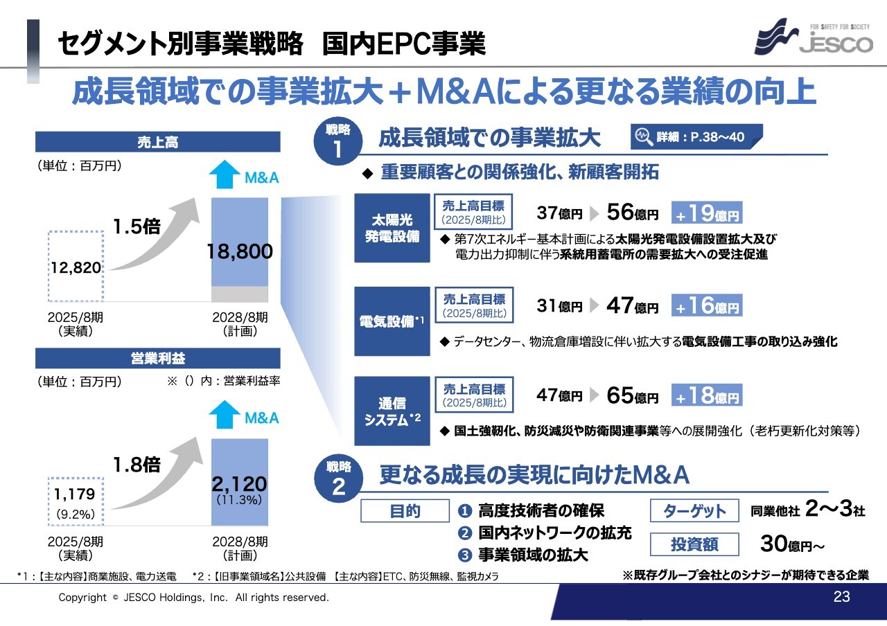 続いて、各セグメントの成長戦略をご説明します。国内EPCですが、サブタイトルに記載しているように、成長領域での事業拡大とともに、M&Aによりさらなる上乗せを目指していきます。数値計画としては、売上で1.5倍、営業利益で1.8倍を目指しています。
