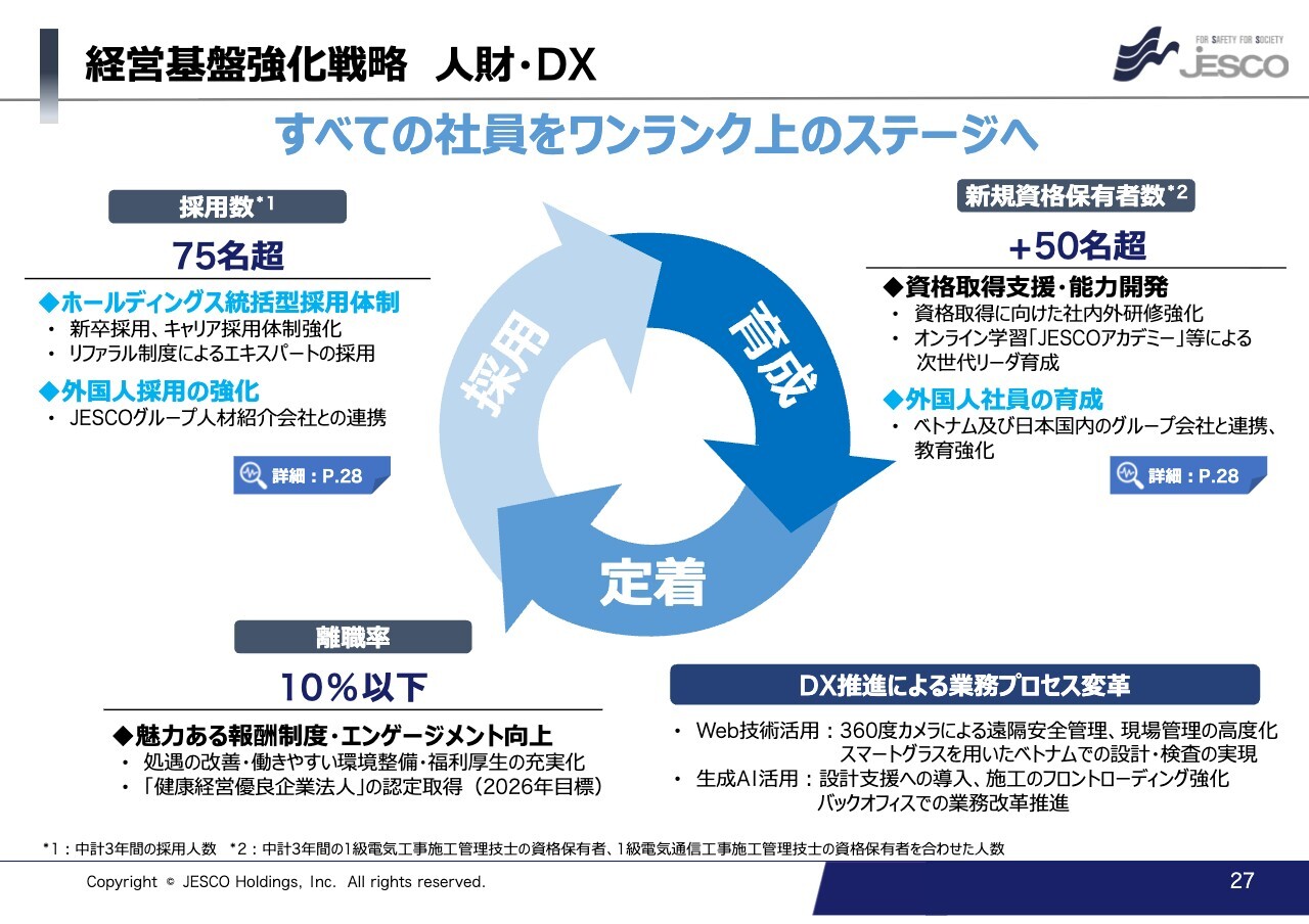 さらに定着に向けて、魅力ある報酬制度や「健康経営優良法人」の認定取得等のエンゲージメント向上により、離職率を10パーセント以下に押さえていきます。また、Web技術や生成AIをフル活用し、DX推進による業務プロセス変革に取り組んでいきます。