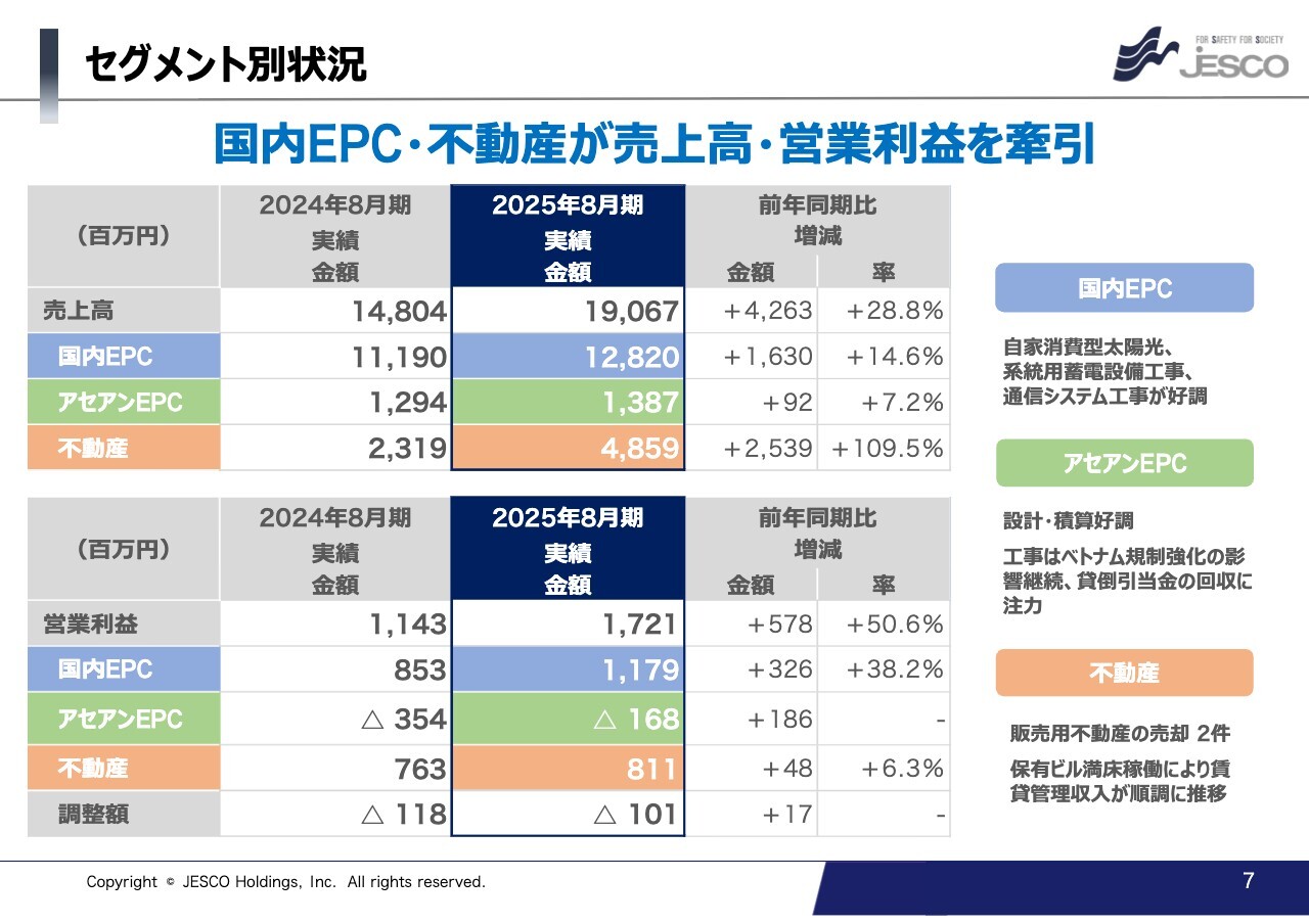 セグメント別の売上高、営業利益についてご説明します。国内EPC事業は売上高が前年同期比14.6パーセント増、営業利益が38.2パーセント増加し、大きく拡大しました。増収増益の要因は先ほどご説明したとおり、再生可能エネルギー分野と通信システムによるものです。