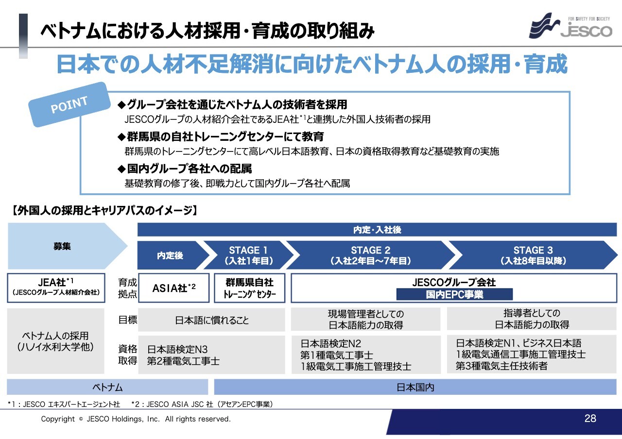 そこで、ベトナム人を日本国内でも採用、育成すべく取り組んでいます。外国人の採用とキャリアパスのイメージを記載していますが、まず、グループ会社のJEA社により現地の大学等と連携して、日本に来たい学生を募集します。