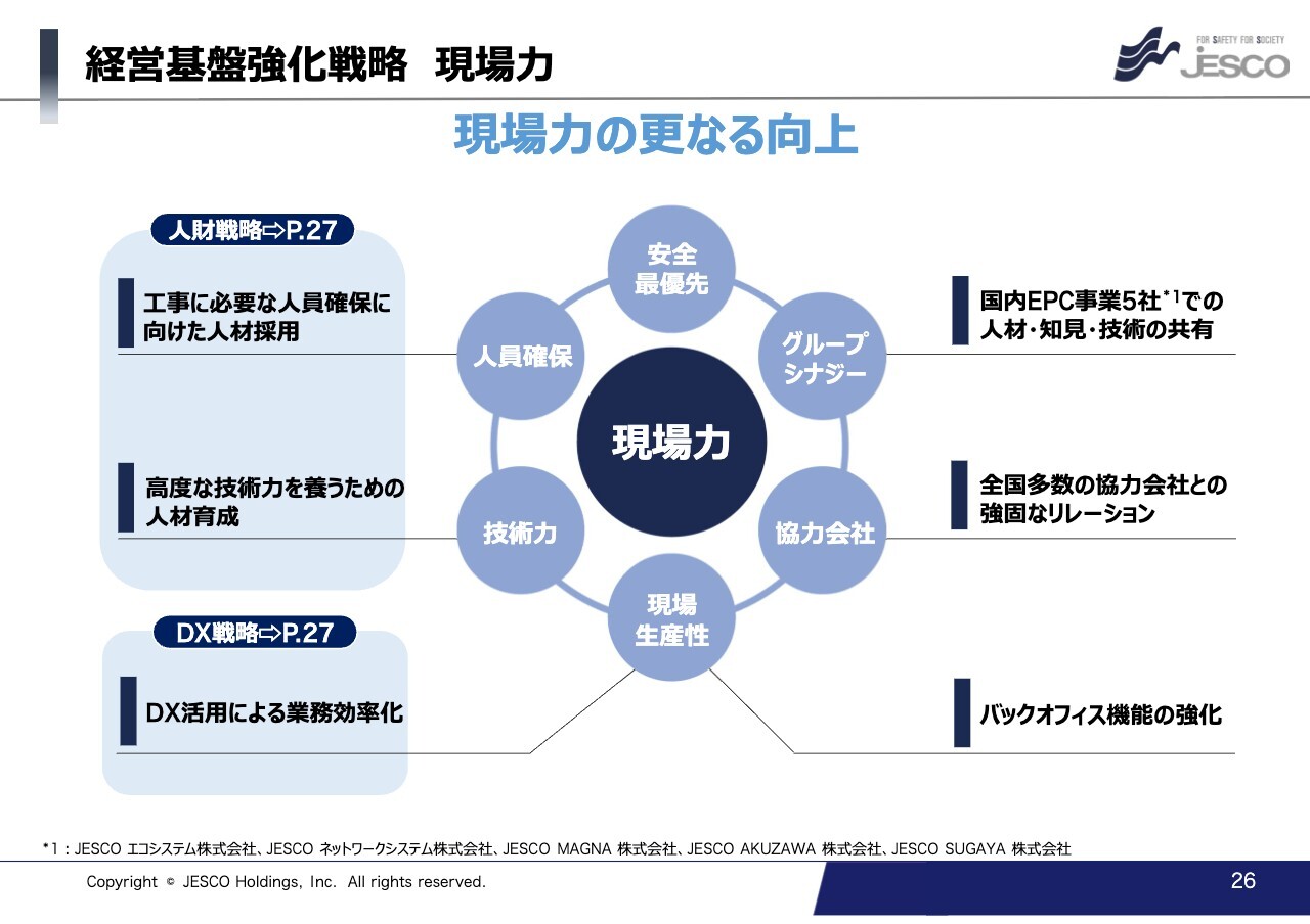1つ目の事業戦略については、成長を加速させるため、国内EPCを柱に据え、今後の成長領域での事業拡大とさらなる成長に向けたM&Aに取り組んでいきます。併せて、現場力の向上による経営基盤強化に取り組んでいきます。