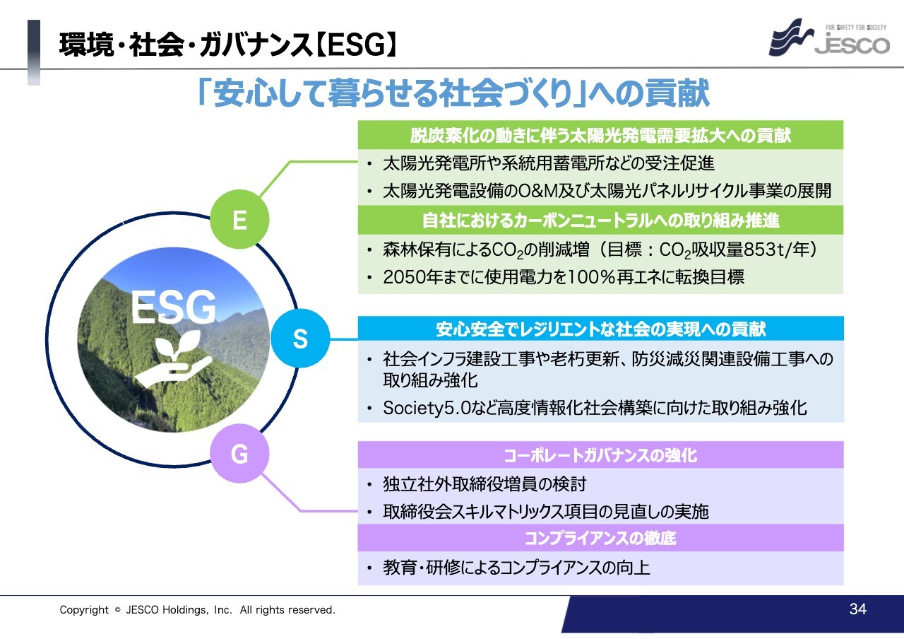 続いて、3本柱の3つ目のESG戦略です。今までは企業としての成長戦略を説明してきましたが、当社では、今まで培ってきた事業や技術を通じて、「安心して暮らせる社会づくり」にも貢献していきたいと考えています。