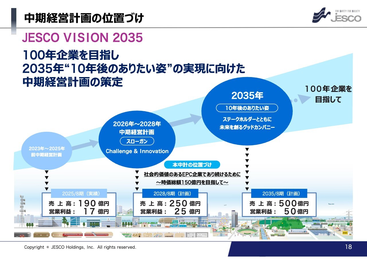 最初に、「中期経営計画の位置付け」についてご説明します。「JESCO VISON 2035」ということで、100年企業を目指し、2035年、「10年後のありたい姿」の実現に向けて、この2026年8月期から始まる3年間の中期経営計画を策定しました。