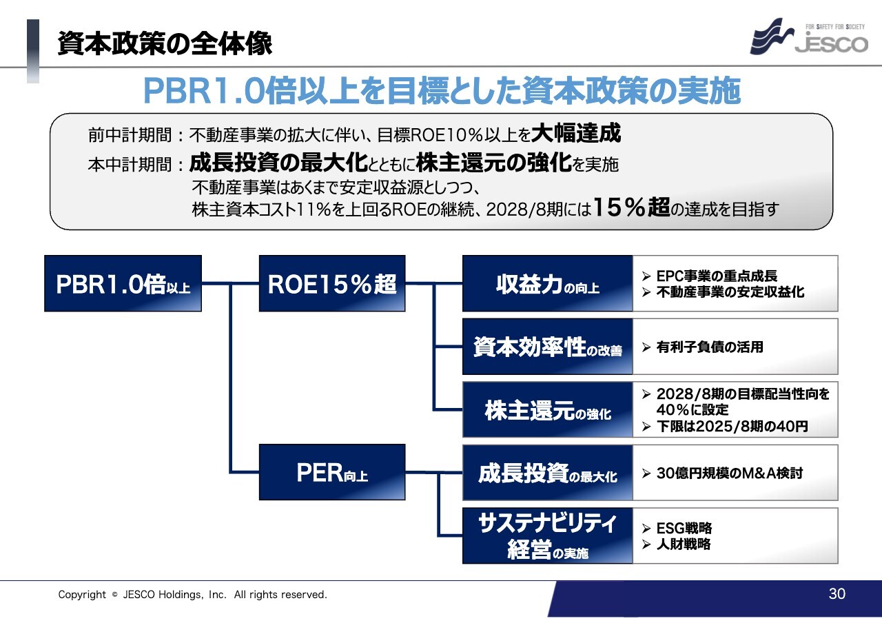 前中計期間においては、不動産事業の拡大により目標とするROE10パーセントを大幅に達成することができましたが、本中期経営計画において、成長投資の最大化とともに株主還元の強化を実現し、不動産事業は安定収益源としつつ、EPC事業の成長により資本コスト11パーセントを上回るROEを継続するとともに、2028年8月期には15パーセント超えを目指していきます。