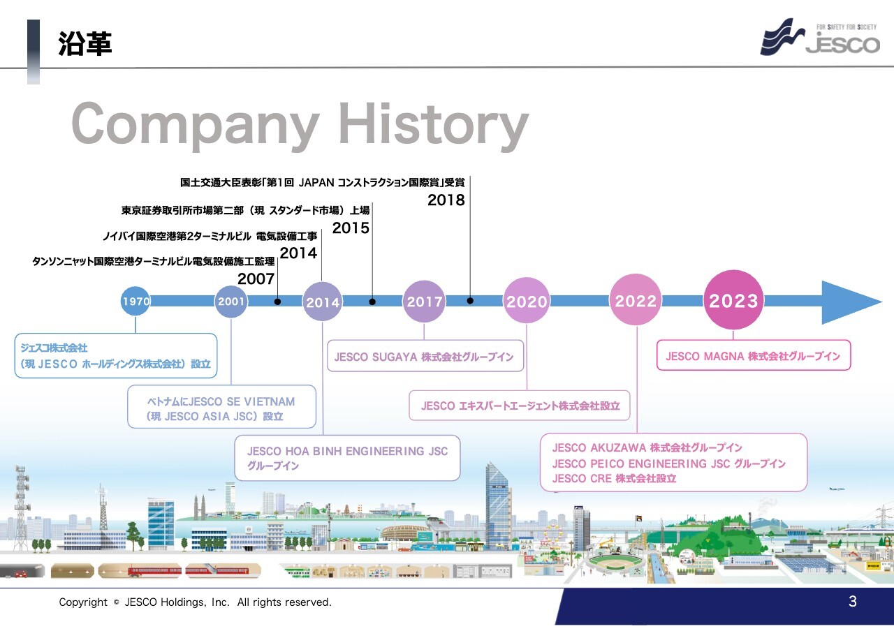 あらためて、当社の沿革について簡単にご説明します。当社は1970年に電気工事会社として設立し、その後電気通信工事へ事業を拡大、2001年にはベトナムへ進出し、国内及びベトナムを拠点として成長を続けてきました。