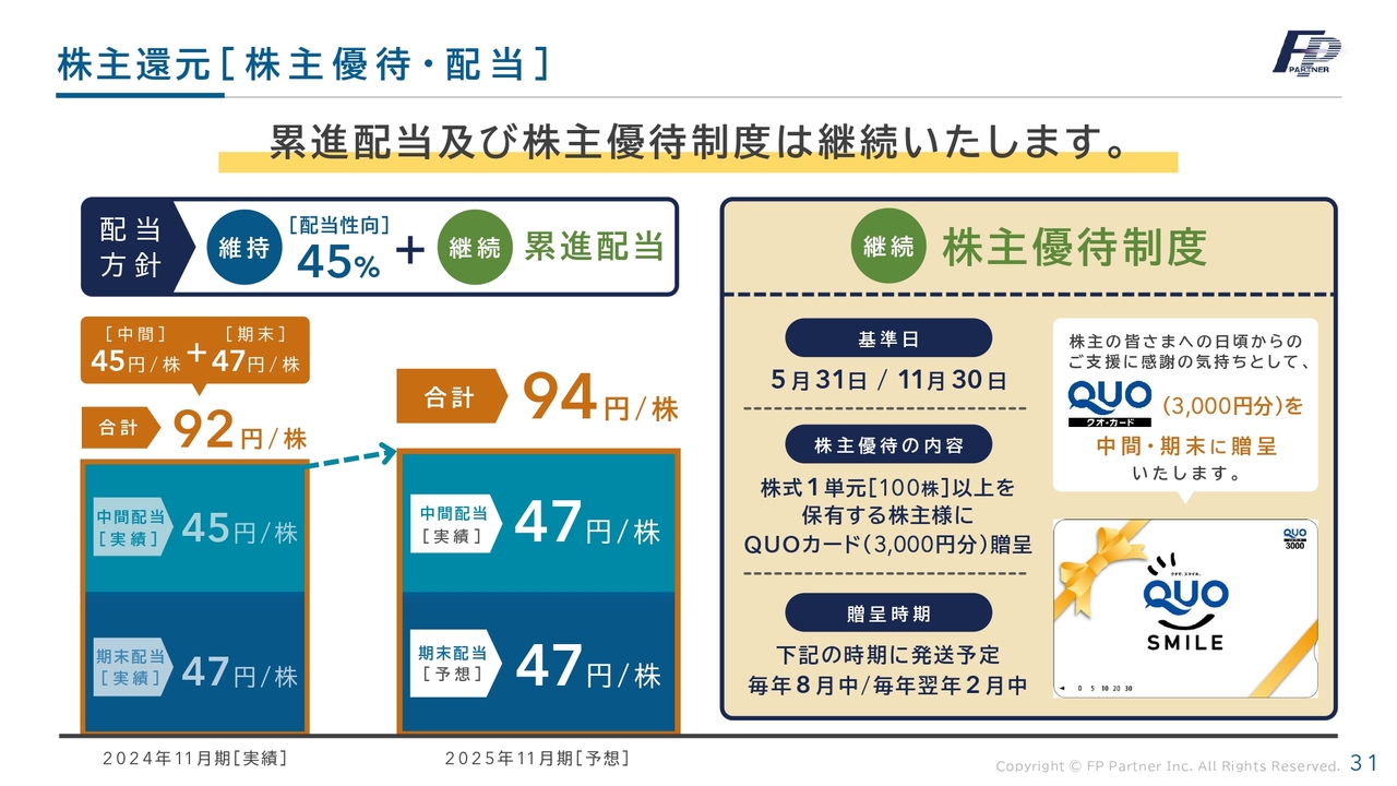 今期は一過性の要因と捉えています。配当性向は45パーセントを大きく上回りますが、累進配当を継続するため、年間配当は94円に据え置きとします。また、株主優待制度については、中間および期末における3,000円のQUOカードを継続したいと考えています。