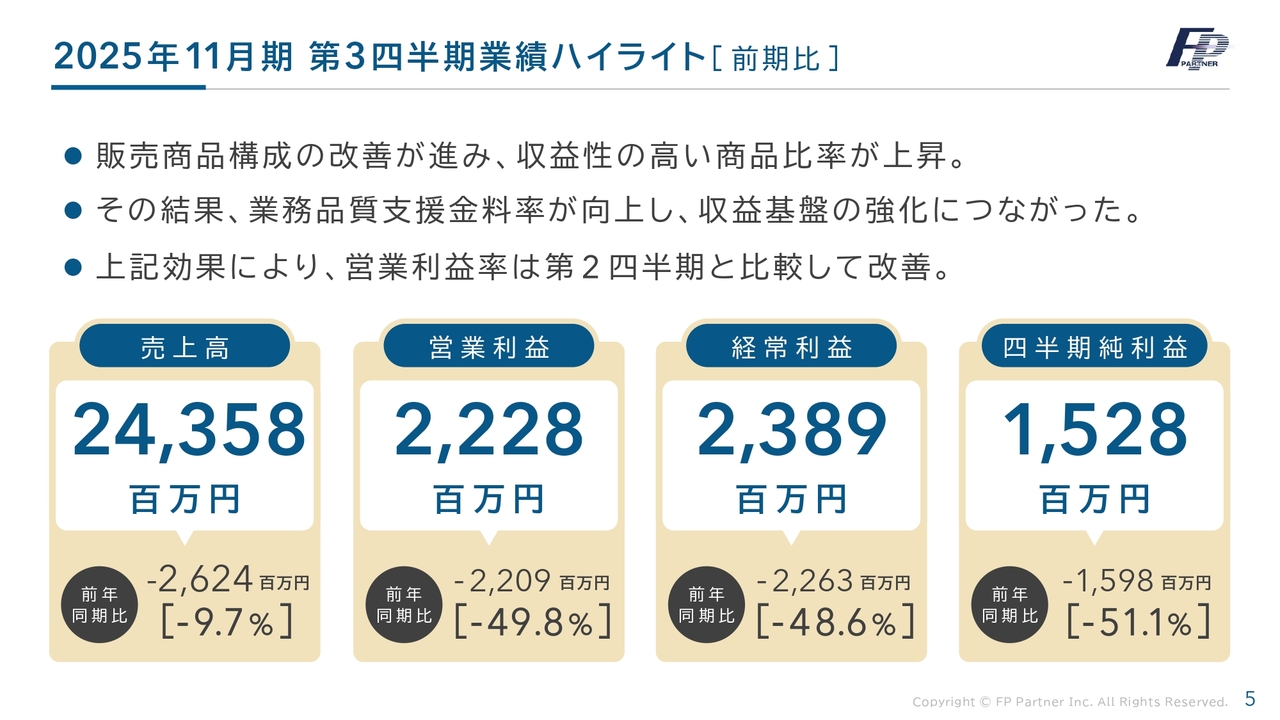 第3四半期の業績ハイライトです。販売商品構成の改善が進み、収益性の高い商品の比率が若干上昇しました。その結果、業務品質支援金料率が向上し、収益基盤の強化につながったと考えています。営業利益率は第2四半期と比べて改善しています。
