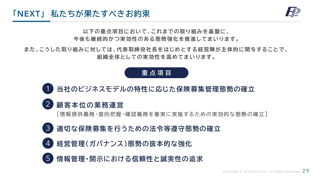 私たちが果たすべきお約束です。重点項目は「当社のビジネスモデルの特性に応じた保険募集管理態勢の確立」「顧客本位の業務運営」「適切な保険募集を行うための法令等遵守態勢の確立」「経営管理(ガバナンス)態勢の抜本的な強化」「情報管理・開示における信頼性と誠実性の追求」です。これらをしっかりと成し遂げるために、代表取締役社長をはじめとする経営陣が主体的に関与し、組織全体としての実効性を高めていきます。