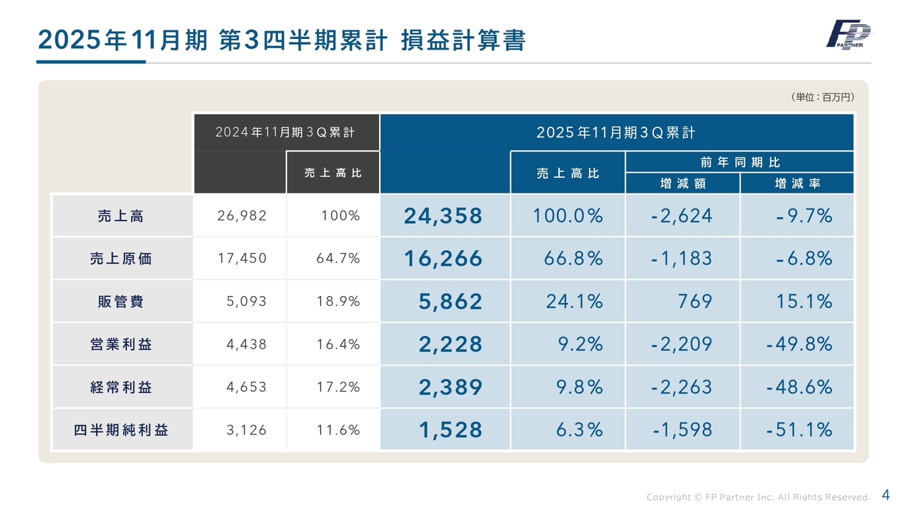 目次の1番目である、2025年11月期第3四半期の業績ハイライトについてご説明します。2025年11月期第3四半期累計の損益計算書では、売上高が243億5,800万円で、前年同期比マイナス26億2,400万円でした。営業利益は22億2,800万円で、前年同期比マイナス22億900万円、四半期純利益は15億2,800万円で、前年同期比マイナス15億9,800万円となりました。