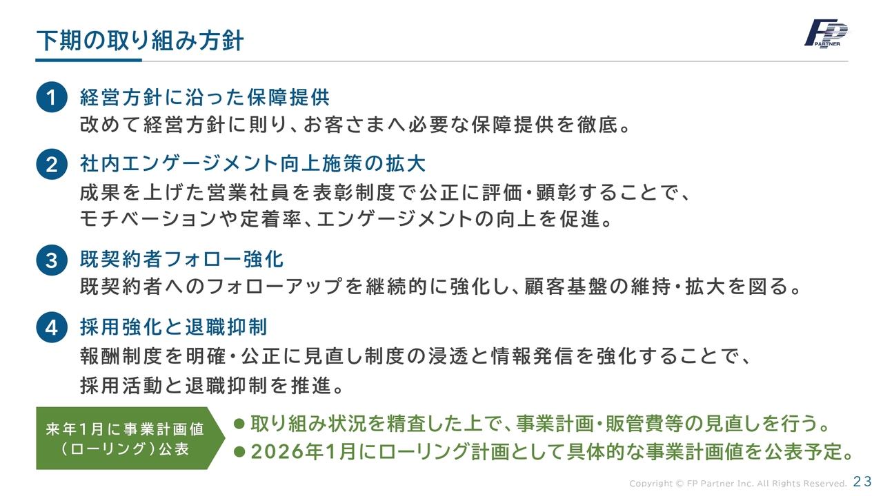 下期の取り組み方針についてご確認ください。まず、「お客さま優先」の姿勢を第一に、お客さまへ必要な保障の提供を徹底していきます。次に、社内エンゲージメント向上施策の拡大を行います。そして、原点に立ち返り、既契約者フォローを強化することで、顧客基盤の維持・拡大を図ります。