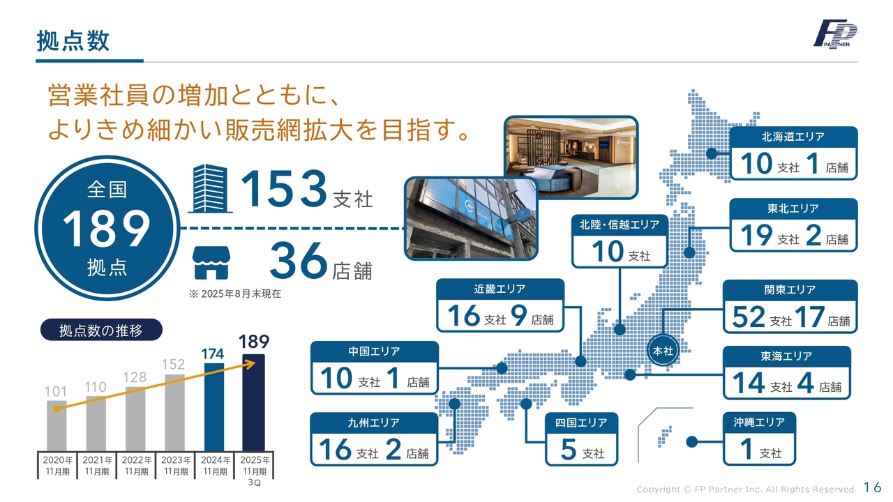 こちらも当社の重要なKPIである拠点数についてです。現在、全国に189の拠点があります。今後も「お客さま優先」の姿勢を貫き、各エリアに支店網を張り巡らせる予定です。