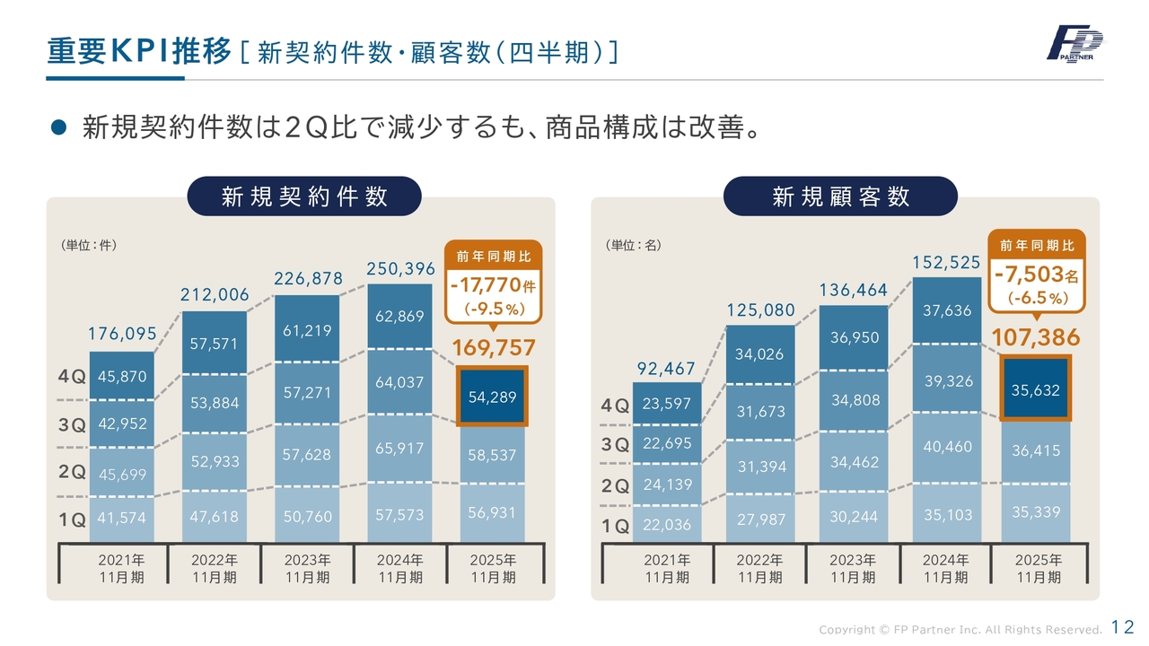 当社の重要なKPIである新規契約件数と新規顧客数の四半期比較です。今期の第3四半期までにおける新規契約件数は16万9,757件と、前年同期比で1万7,770件減少しました。第3四半期は前年同期比で9,748件減少し、5万4,289件となっています。