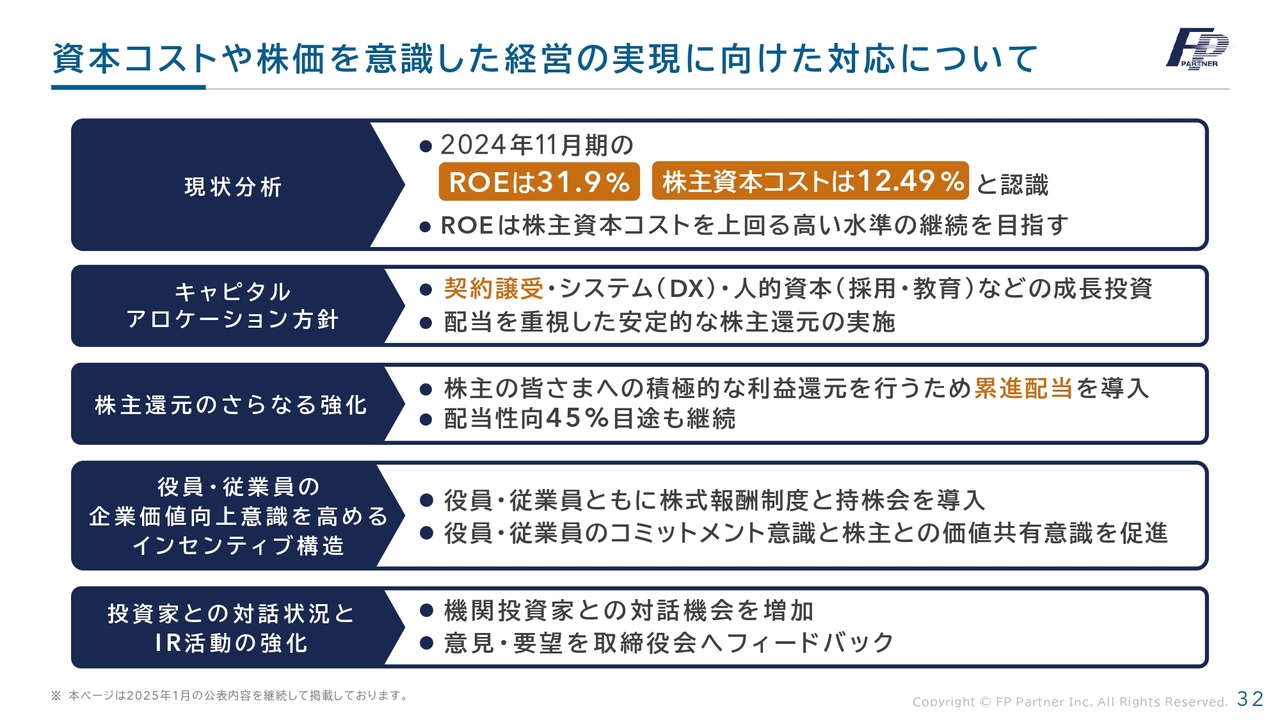現状分析として、前期のROEは31.9パーセント、株主資本コストは12.49パーセントと認識しています。ROEは株主資本コストを上回る高い水準の維持を目指していきます。今後は契約譲受、システム(DX)、人的資本などへの成長投資も行っていきます。また、先ほど説明したとおり、配当性向は45パーセントを継続し、累進配当の導入を進めていきます。