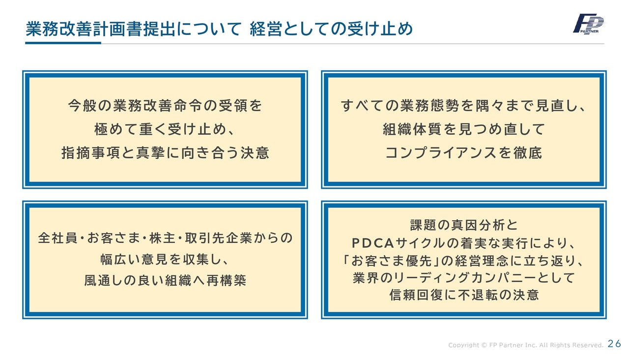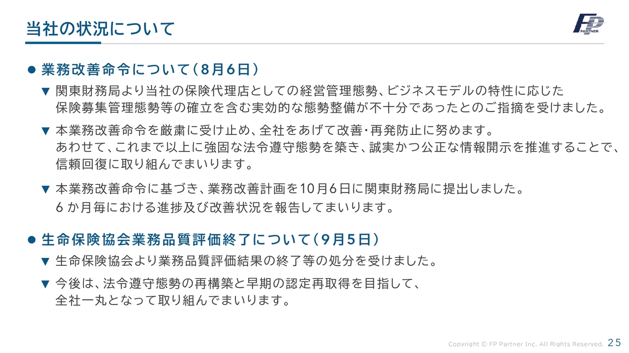 はじめに、8月6日付で受領した業務改善命令に関してご説明します。当社は関東財務局より、保険代理店としての経営管理態勢や、ビジネスモデルの特性に応じた保険募集管理態勢の確立を含む、実効的な態勢整備が不十分であるとの指摘を受けました。