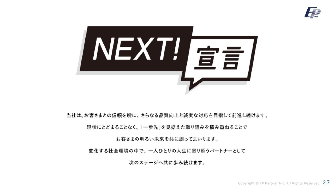 当社の決意を「NEXT!宣言」として表明します。当社は、お客さまとの信頼を礎に、さらなる品質向上と誠実な対応を目指して前進し続けます。現状にとどまることなく、「一歩先」を見据えた取り組みを積み重ねることで、お客さまの明るい未来をともに創っていきます。