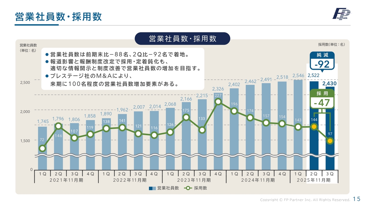 営業社員数と採用数についてお伝えします。第3四半期の営業社員数は総勢2,430名で、前四半期比で92名減少しました。