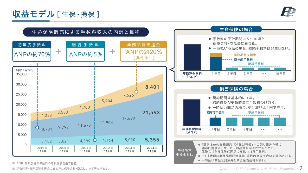 お客さまにご契約いただくと、初年度には初年度手数料と業務品質支援金という大きな手数料が得られます。一方で、継続手数料は、お客さまが解約されない限り、約10年間にわたり約5パーセントの手数料が発生します。このストック収入は創業当時にはほとんどありませんでしたが、昨年11月期には53億5,500万円の継続手当が計上されています。