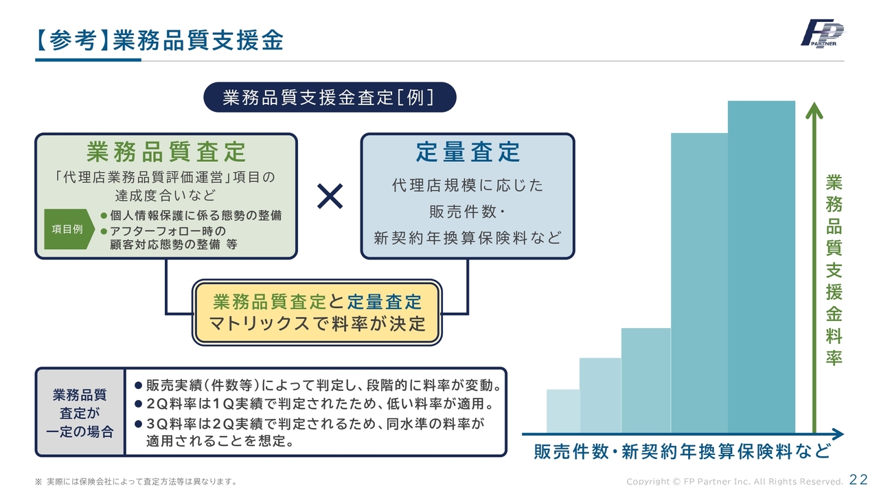 業務品質支援金の仕組みについてです。6月と7月の保険募集の結果により、次の第4四半期の業務品質支援金の料率が決定します。5月、6月、7月の新規販売量はまだ元の水準に戻っていませんが、第4四半期には料率は低いものの、販売量は増加すると考えています。