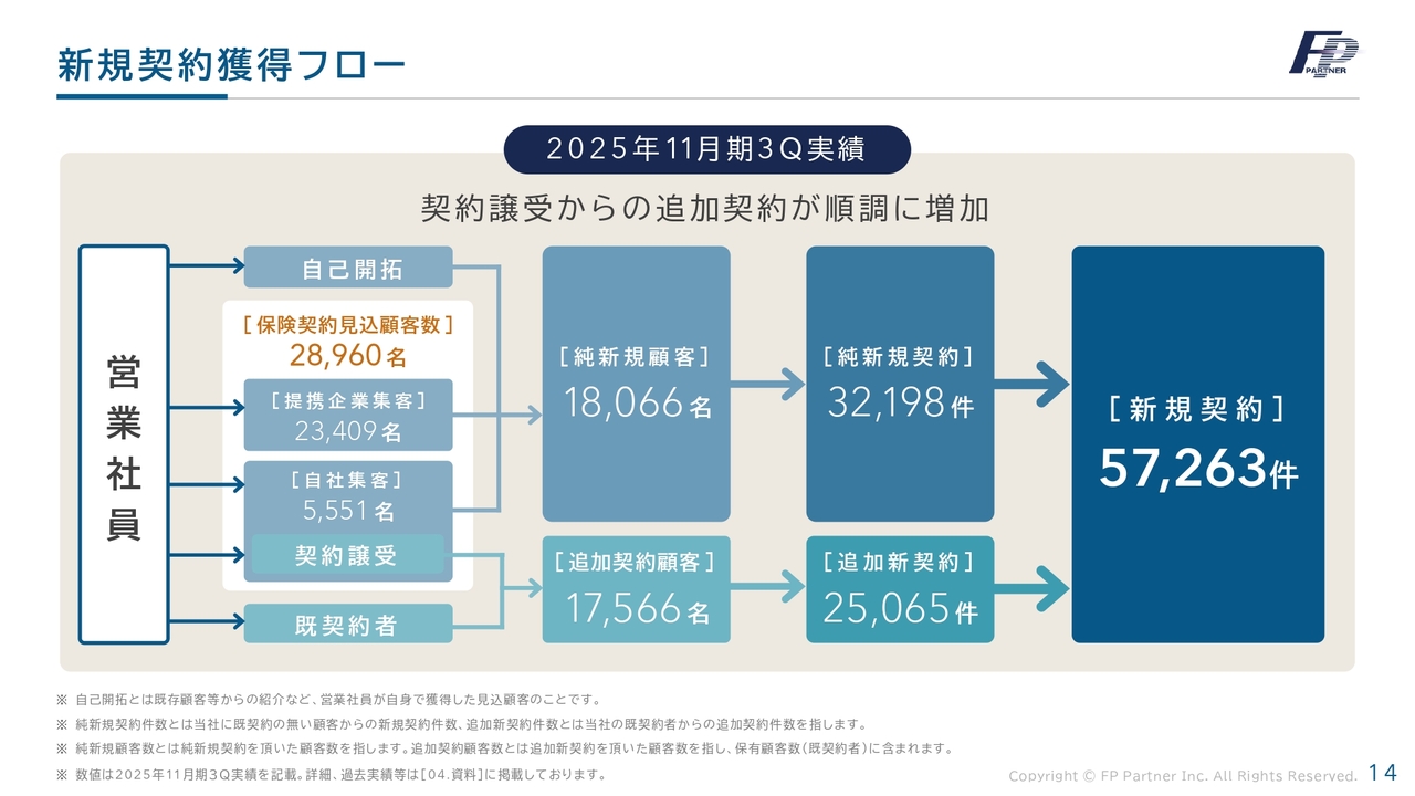 その結果、提携企業からの集客だけでなく、追加契約顧客および追加新契約が増加し、新規契約は5万7,263件となりました。