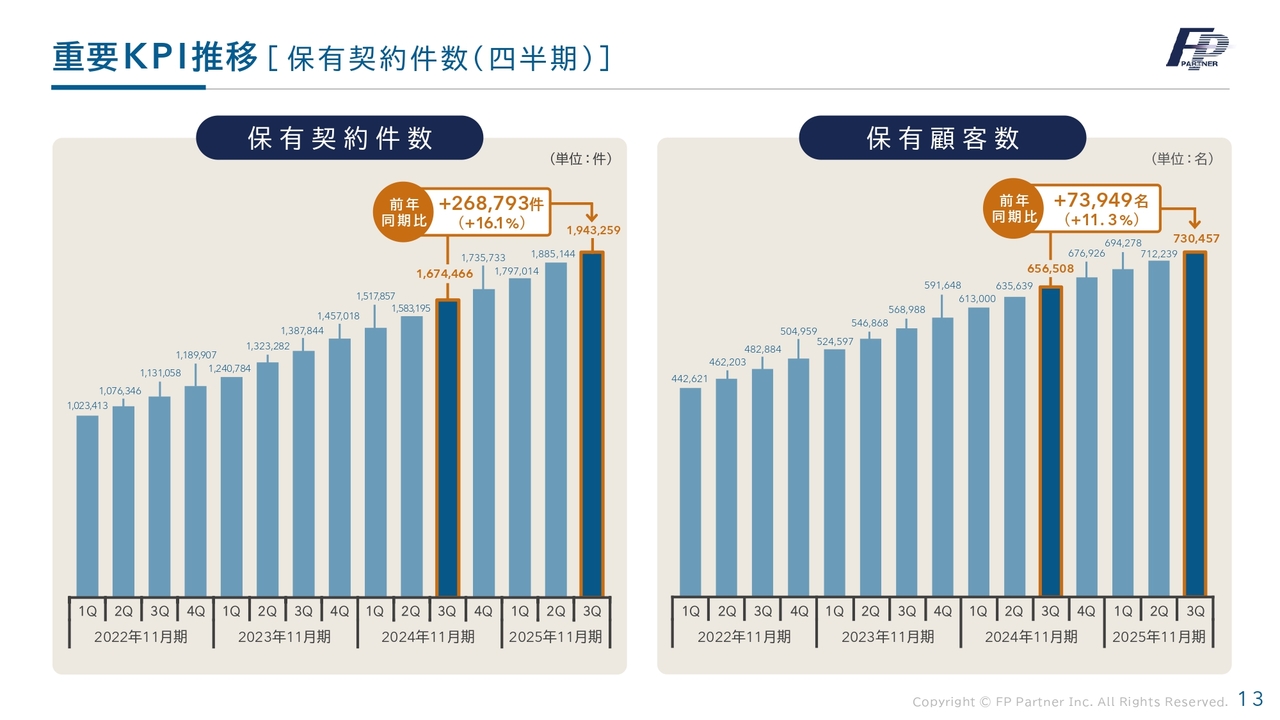 当社の最も重要なKPIである保有契約件数と保有顧客数の四半期ごとの比較です。こちらは順調に推移しています。