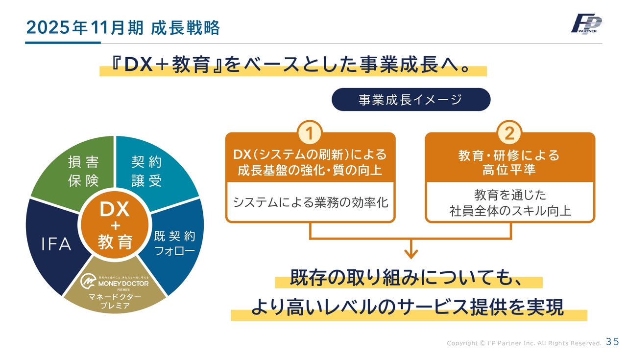 最後に、2025年11月期の成長戦略の進捗についてです。「DX+教育」を基盤とした事業成長を推進していきます。既存の取り組みも、より高いレベルでのサービス提供を実現します。