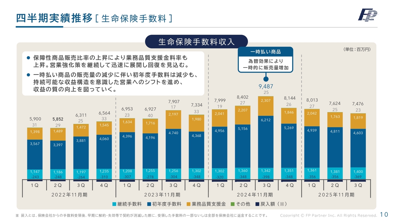 生命保険手数料の四半期ごとの内訳です。手数料収入は減少していますが、保障性商品の拡大が進み、利益の貢献につながっています。第4四半期以降は徐々に回復を図りたいと考えています。