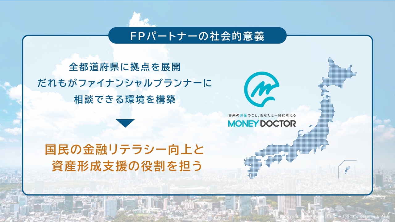 FPパートナーの社会的意義についてです。全国の都道府県に拠点を展開し、誰もがファイナンシャルプランナーに相談できる環境を構築してきました。