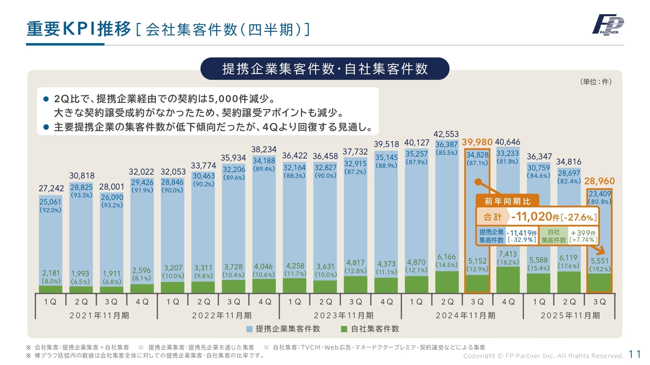 当社の重要なKPIである会社集客の約5年間の四半期ごとの成績です。第3四半期は前年同期比で1万1,020件減少し、2万8,960件となりました。過去の第3四半期と比較して大幅に減少しています。