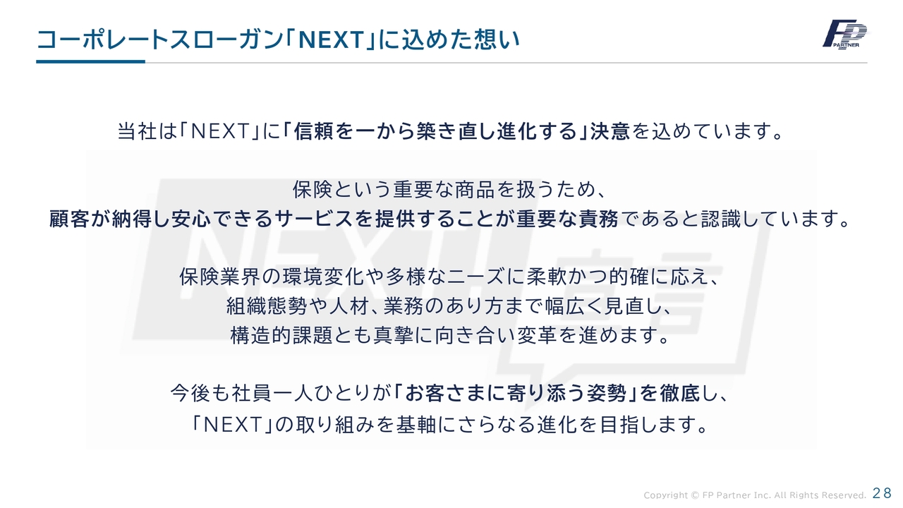 当社は「NEXT」に「信頼を一から築き直し、進化する」という決意を込めています。保険という重要な商品を扱ううえで、顧客が納得し、安心できるサービスを提供することが重要な責務であると認識しています。