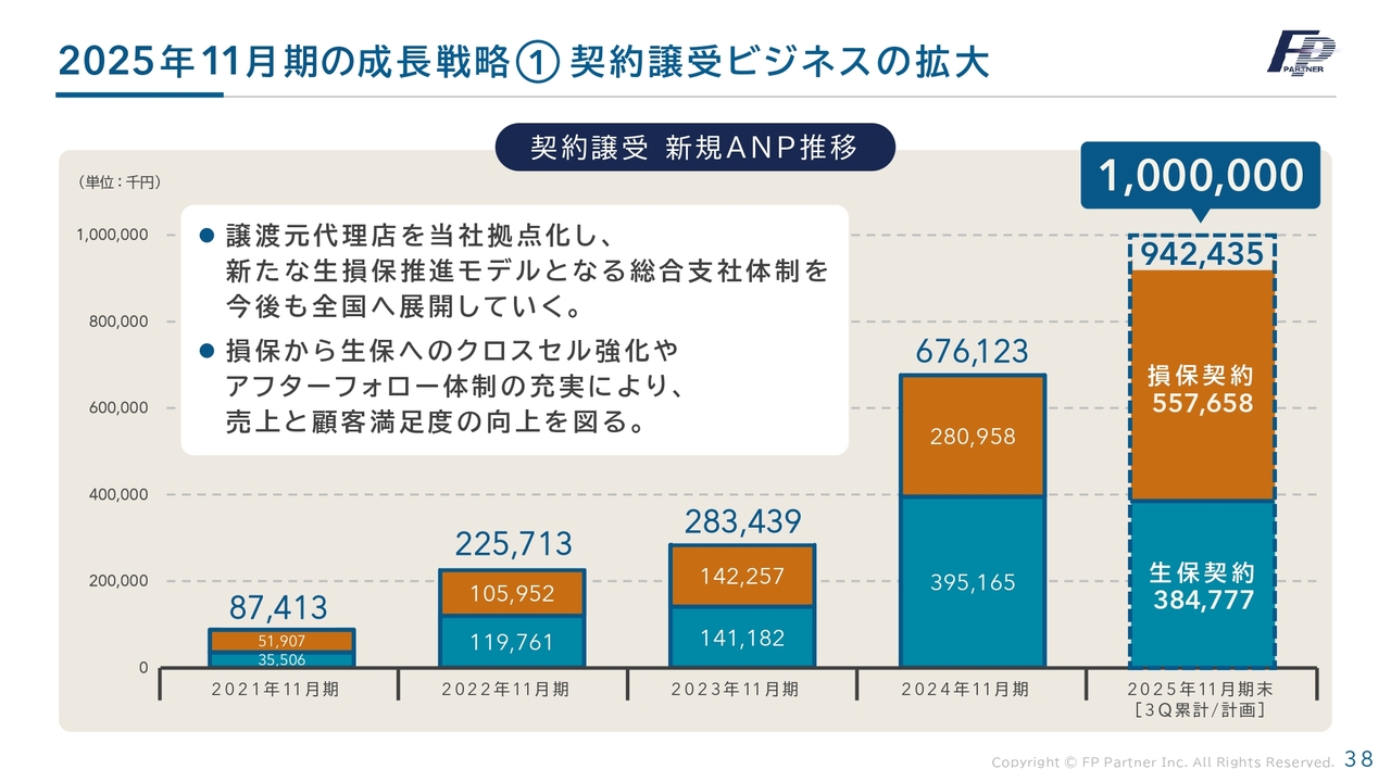 損害保険事業の拡大についてです。こちらは契約譲受が中心となり、前期は4万7,221件の顧客移管が完了しました。今後、損害保険の売上はさらに伸びていく予定です。