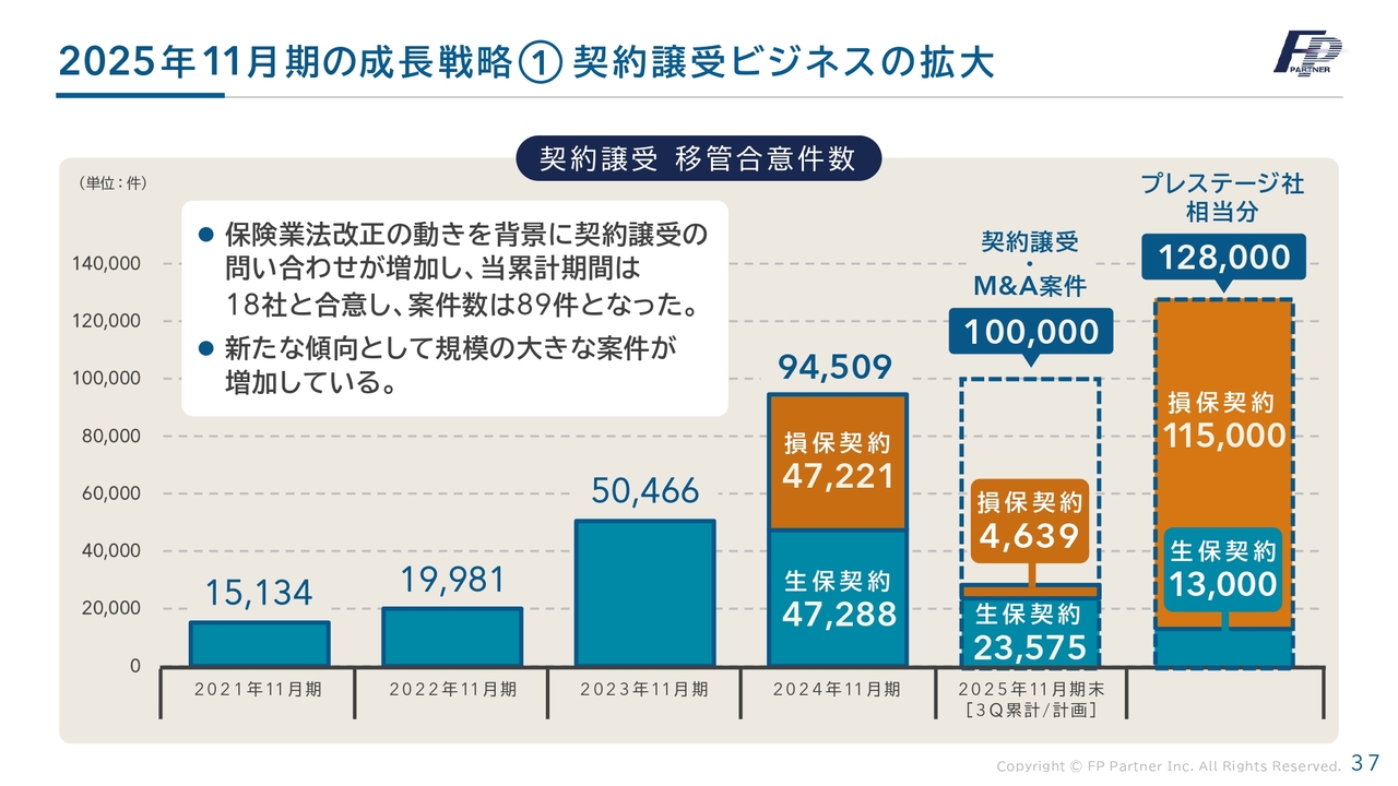 そして、昨今は大型代理店からの問い合わせが増加しています。その結果、今回のプレステージ社の12万8,000件の契約移管に成功しました。この成果を新規契約につなげ、高い利益率が見込まれる案件へと変えていきたいと考えています。