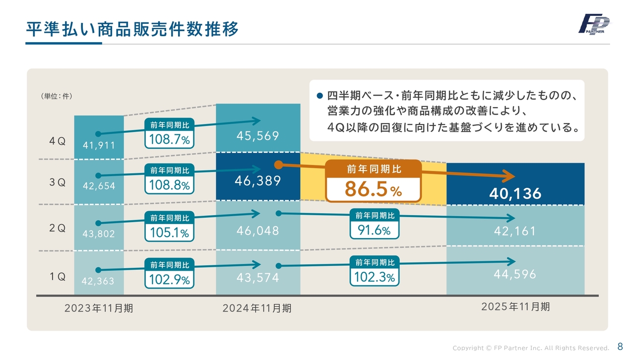 当社が力を入れている平準払い商品の販売件数の推移です。第3四半期においては、前年同期比86.5パーセントの4万136件と大きく減少しました。一方で、保障性商品への販売シフトが増加し、利益面では改善傾向にあります。