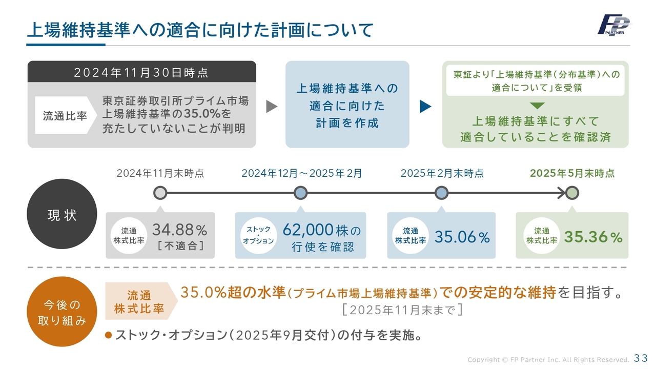 上場維持基準への適合に向けた計画についてです。この内容は、10月9日に適時開示を行いました。2025年5月末時点で、東証より「上場維持基準への適合について」を受領しており、この時点での流通株式比率は35.36パーセントです。