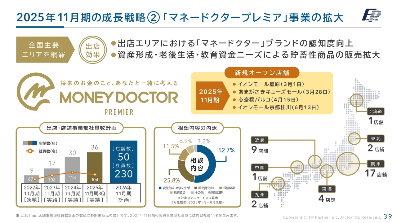 マネードクタープレミアの拡大についてです。現在は36店舗を展開していますが、2026年11月期までに50店舗、社員数を230名に増やす予定です。