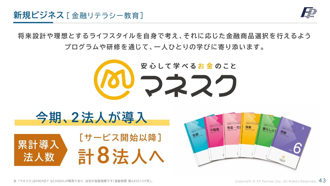 「マネスク」についてです。当社は、日本全国でファイナンシャルプランニングを行ってきました。さらに金融リテラシー向上のため、「マネスク」を開始し、計8法人への「マネスク」の導入が決定しています。