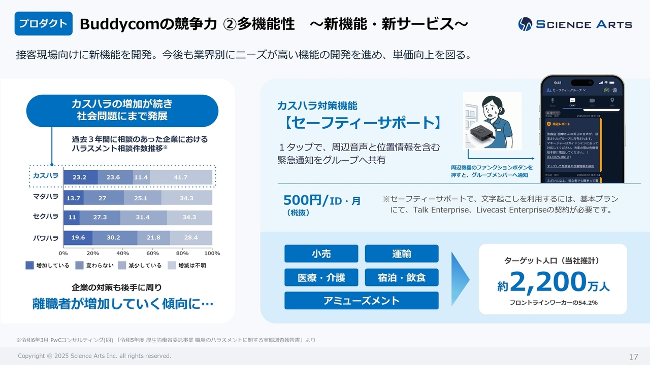 「Buddycom」の競争力についてです。当社はサービス業を含め、フロントラインワーカーの方々にご利用いただいています。昨今話題になっているカスハラの問題に関連する彼らの悩みに着目し、「セーフティサポート」という機能を開発しました。