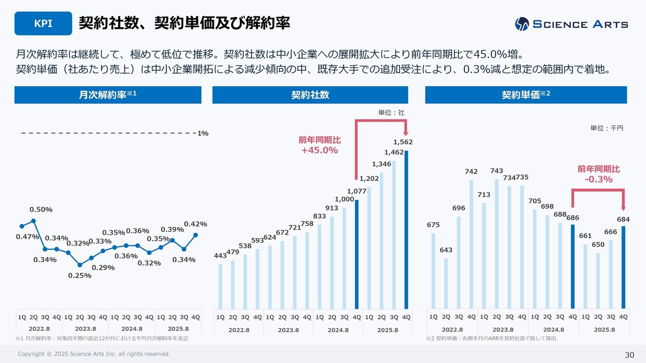 契約社数、契約単価および解約率についてです。第4四半期の解約率は0.42パーセントと若干増加しましたが、これはBCP利用のお客さまの解約によるものです。一部のお客さまがBCPとして利用されていますが、その割合は1パーセント未満のため、今後何かがあっても軽微な影響にとどまると考えています。
