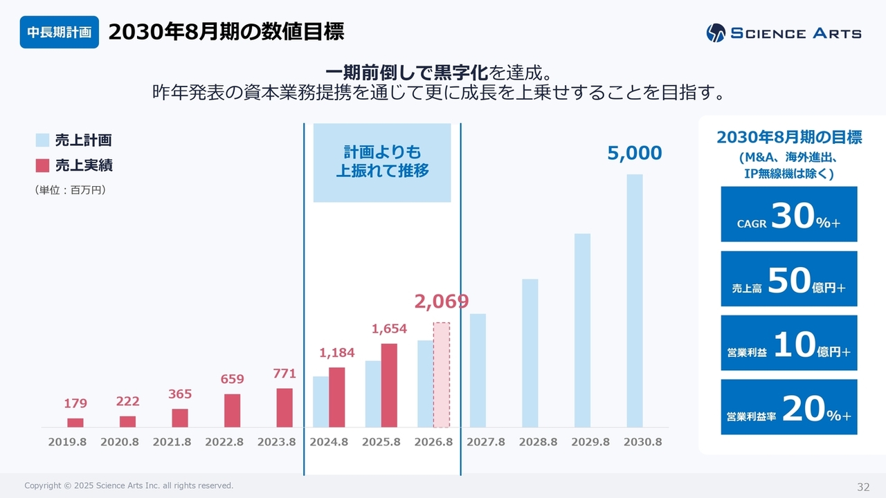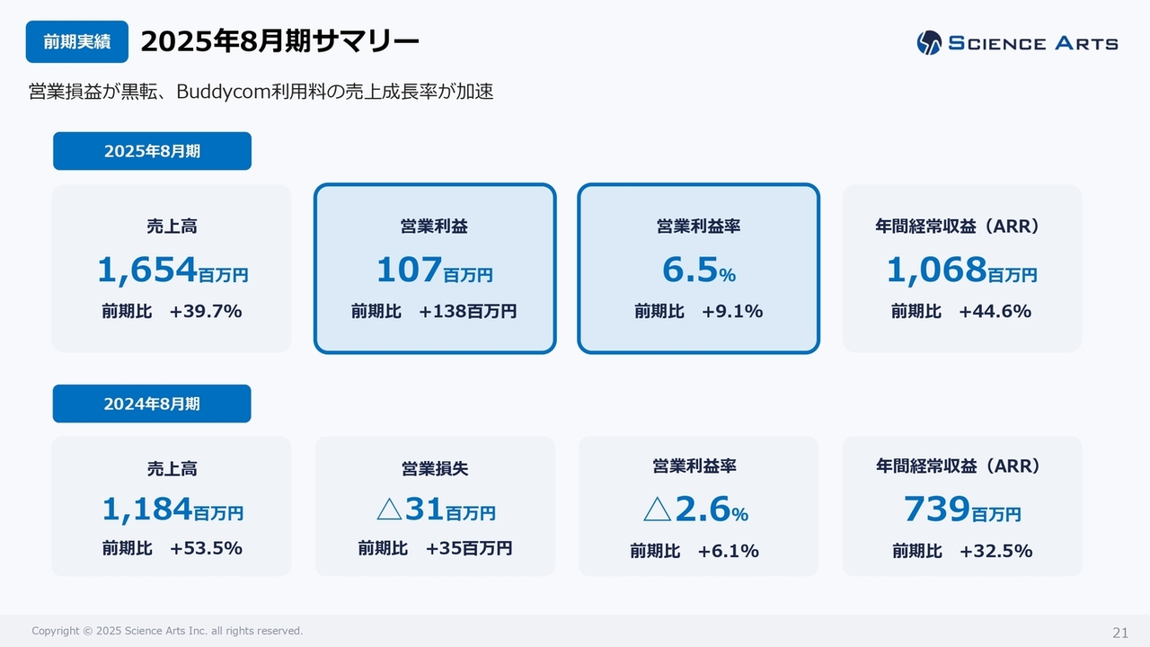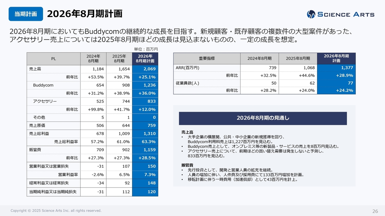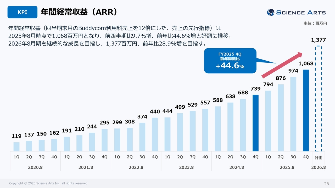 ARRは前年同期比44.6パーセント増と非常に順調に推移しています。2026年8月期には13億7,700万円を計画しています。