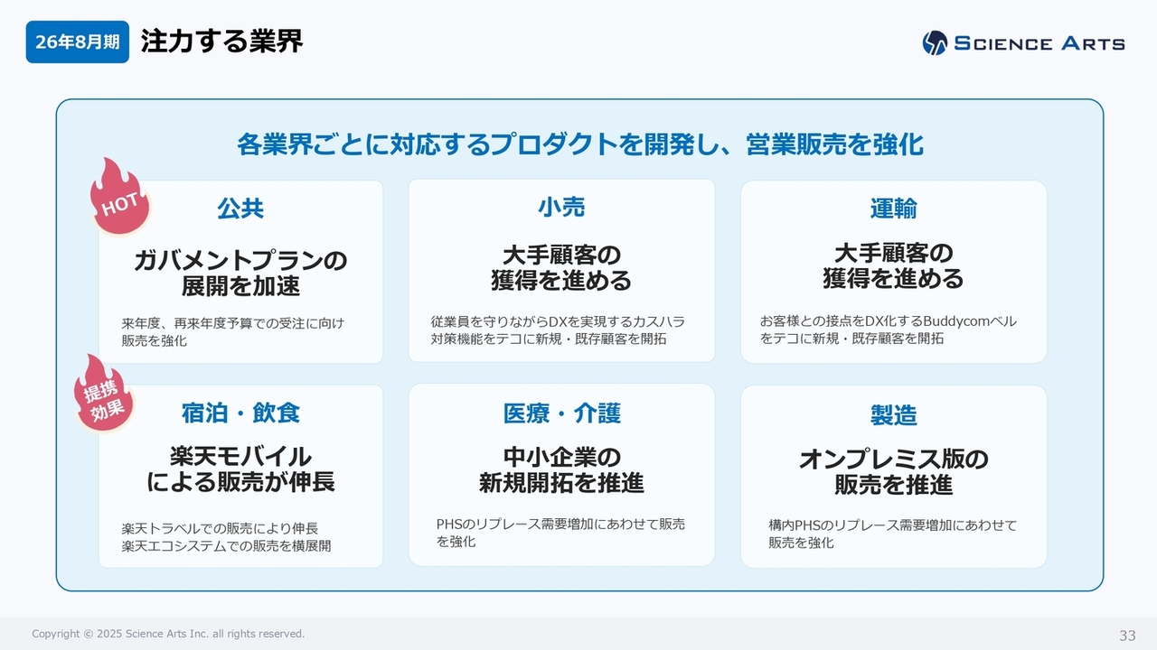 今後の注力業界としては、飲食、ホテル、小売、医療、介護の5業界を中心に、楽天エコシステムを活用し、当社の「Buddycom」と楽天のAIを組み合わせて販路拡大を目指します。すでに介護分野においても、大手の介護事業者が楽天経由で契約するなど、こちらでも大きな手応えを感じています。