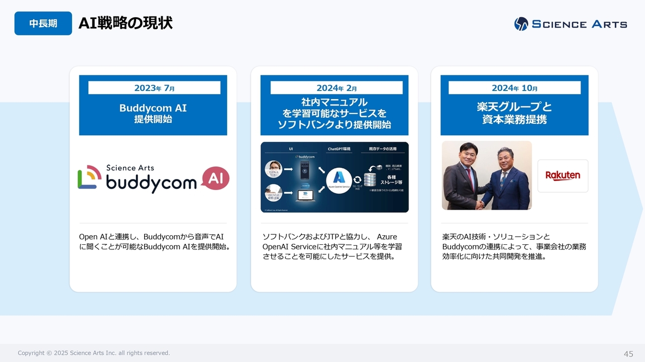 AIの現状についてです。「Buddycom AI」の提供や、ソフトバンクとの協力によるマニュアル学習可能なサービスの提供、さらに楽天グループとの資本業務提携を通じて、現在AIに対して非常に積極的な投資を行っています。