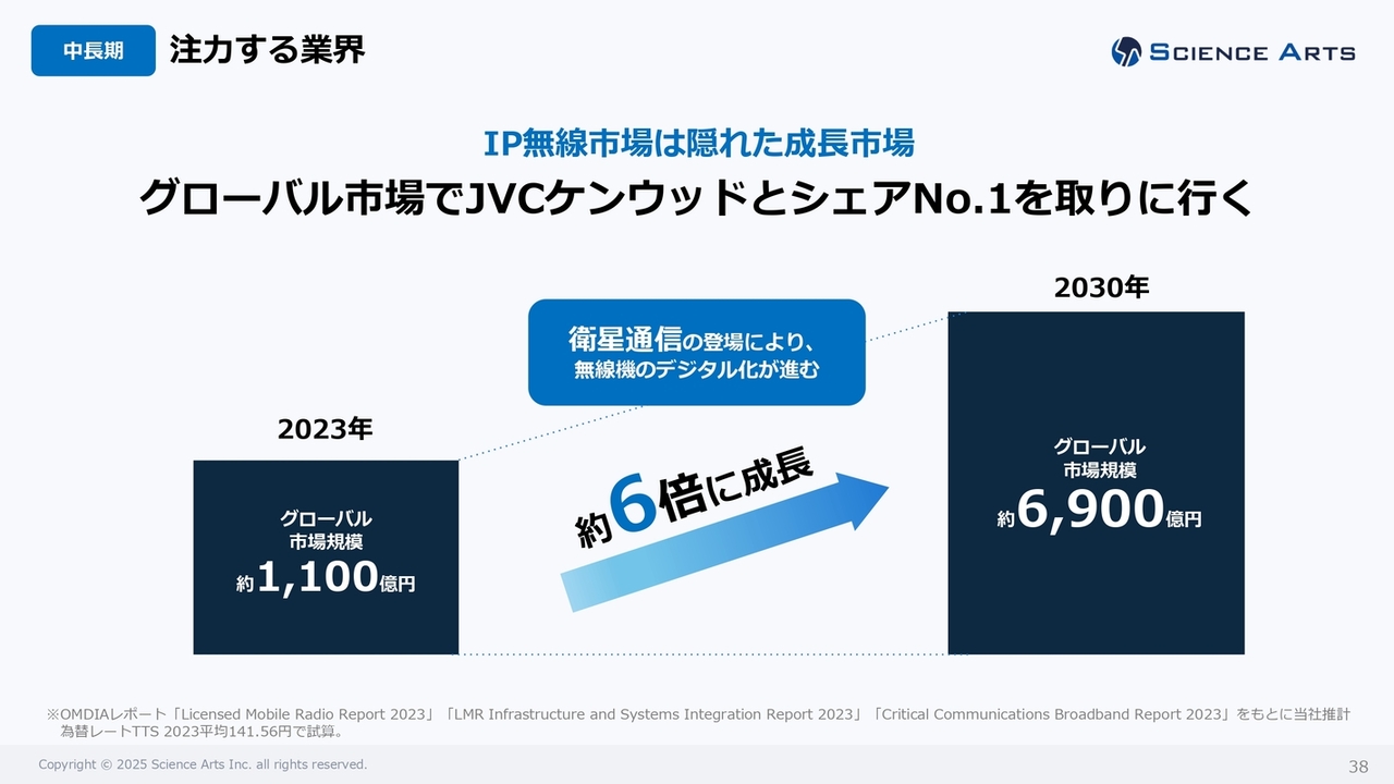 「グローバル市場でJVCケンウッドとシェアNo.1を取りに行く」ことについてです。IP無線の市場は隠れた成長市場です。衛星通信の登場により無線機のデジタル化が進み、基地局が不要となっていきます。これにより約6倍の市場規模に成長すると予測されており、非常に有望なマーケットだと期待しています。