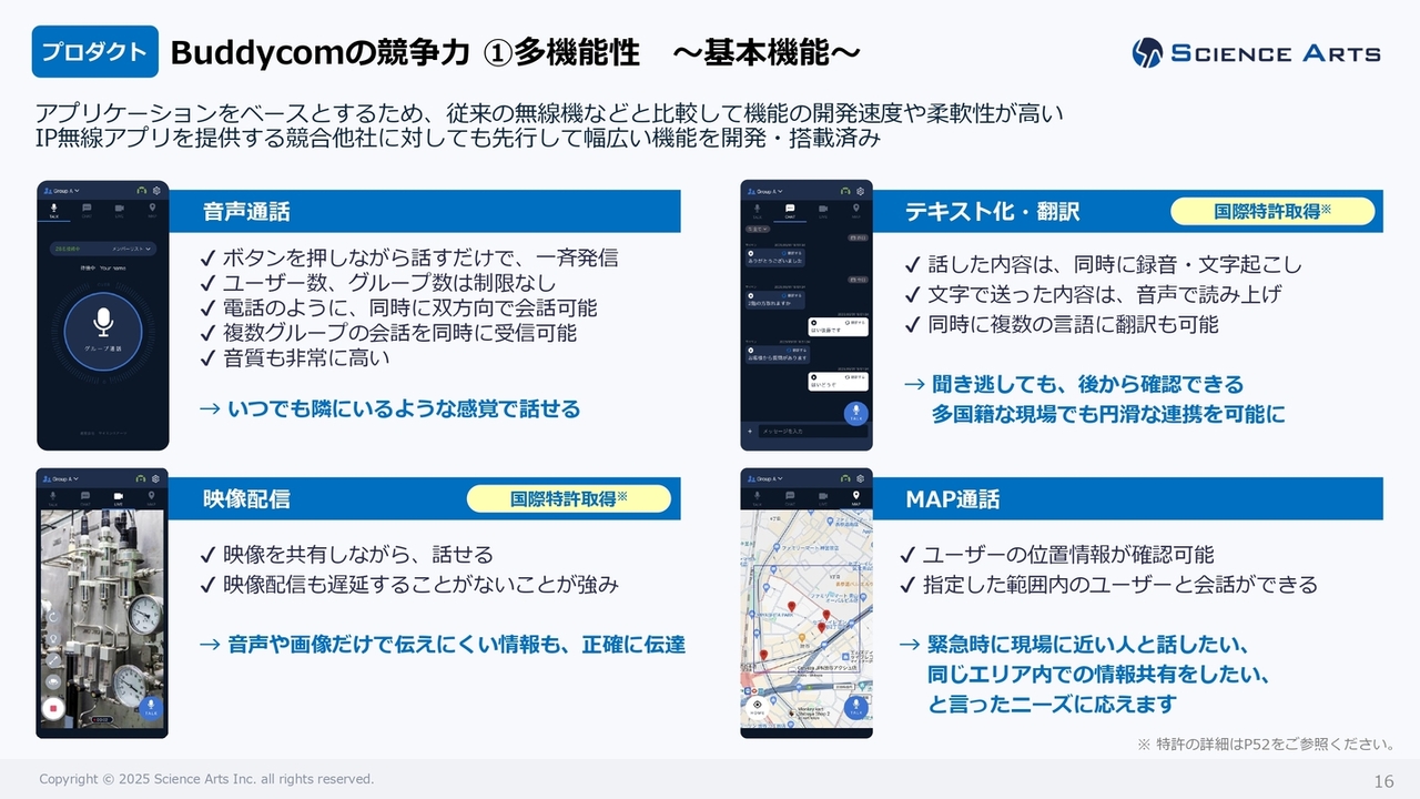 一般的な無線との大きな違いは、通常の無線は音声通話が主流であるのに対して、当社の製品はテキスト化や翻訳、さらに映像配信など、多岐にわたるマルチな情報提供や情報交換が可能です。これにより、意思や状況が非常に迅速に伝わると高く評価されています。特に映像配信、テキスト化、翻訳に関しては、国際特許を取得しています。