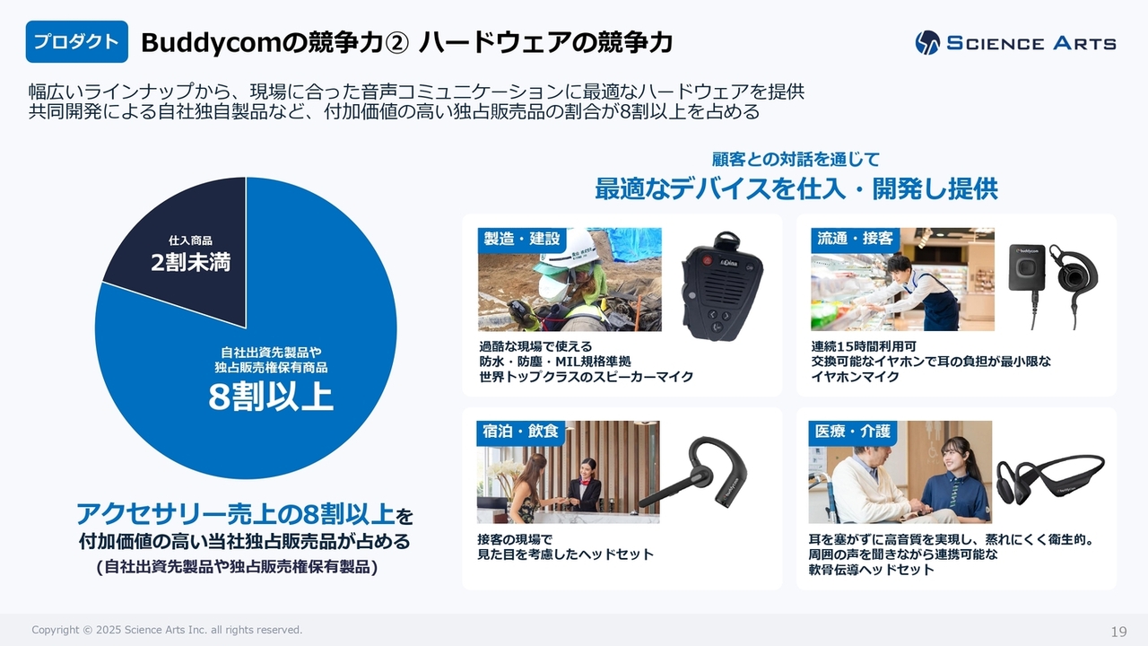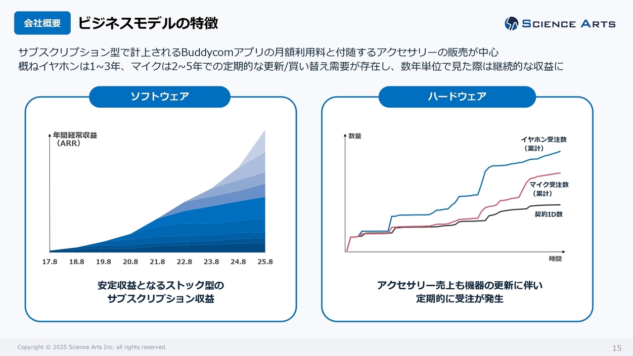 1つの特徴として、ソフトウェアは継続的なサブスクリプション収入となっていますが、ハードウェアについても、契約ID数よりマイクやイヤホンの受注数が多い状況です。数年経つと必ず買い替えのタイミングが訪れるため、ハードウェアもある意味でストック型ビジネスといえるかと思います。