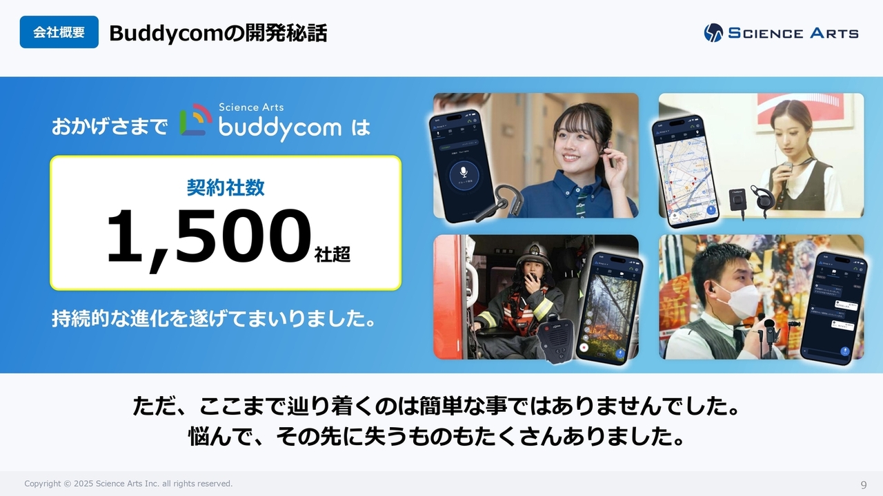 現在、2015年に「Buddycom」が誕生してから約10年が経過しています。契約社数はすでに1,500社以上となり、継続的な進化を遂げてきました。ここにたどり着くまでには非常に多くの苦労がありました。その沿革を少しご紹介します。