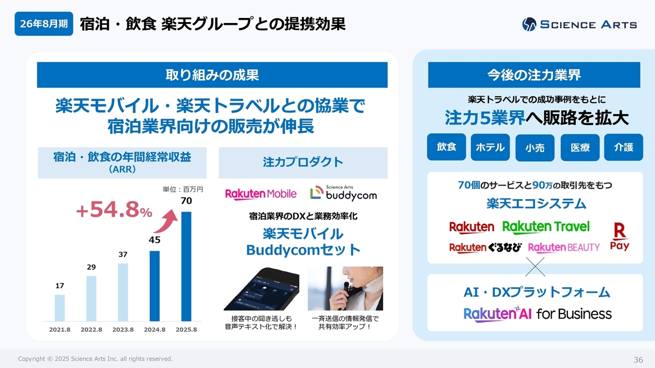 まず、楽天モバイルおよび楽天トラベルとの協業により、宿泊業界向けの販売が大きく伸びました。2024年8月期から2025年8月期にかけて、倍に近い伸びを達成できたことで、今回の事業提携に非常に手応えを感じています。