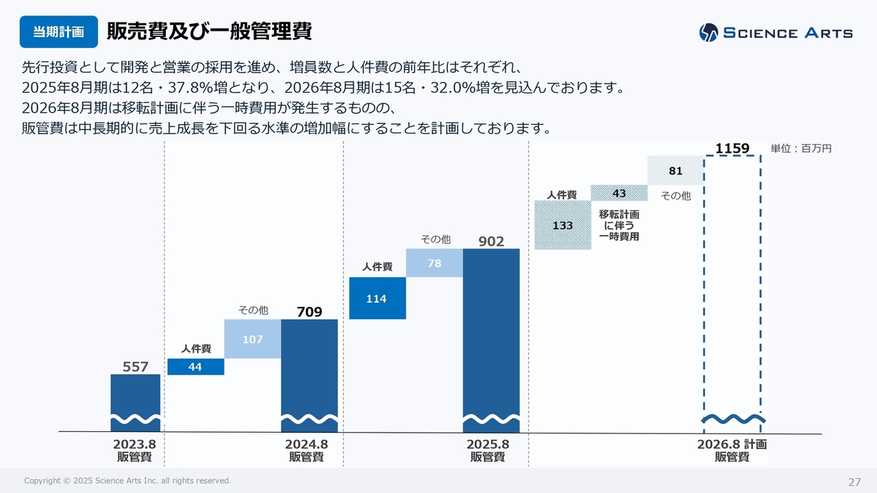 販管費および一般管理費についてです。人件費に関しては、2026年8月期の計画ではやや増加する見込みです。移転に伴う費用やその他の費用については、前期と比べて大きな変化はないと考えています。
